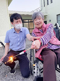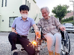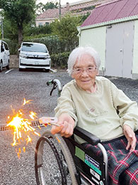 連日の猛暑でうんざりしますが、夏だからこその楽しみと言えば「花火」で すね。 山口苑では日が沈み、暑さが和らぐ夕方に、花火を楽しみました。 久しぶりに手持ち花火を手に持って楽しんだ後は、噴き上げ花火を行い、 薄暗くなった空に美しい火花が舞い上がると、思わず拍手され、「わぁ~! 綺麗!」と歓声が沸き起こりました。
