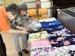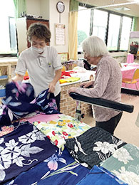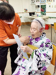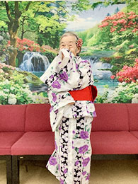 9月に入ってもまだまだ暑い日が続きますね。 山口苑では、少しでも涼をとってもらおうと、浴衣の着付けを行いました。 たくさんある浴衣からお気に入りの一着を選んでもらい、お化粧や髪飾りも 付けて、すまし顔で写真をパシャリ!皆さん、とってもべっぴんさんですね! 数十年振りに浴衣を着用された方もおられ、ウキウキされていました。 おしゃれをすると身も心も元気になりますね!
