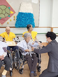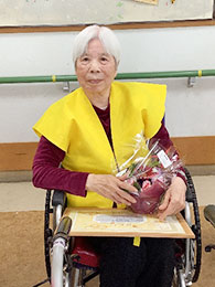 山口苑では、敬老会を開催しました。 喜寿や米寿など節目の年齢を迎えた方や100歳以上のご長寿の方に感謝状と 花束を施設長からお渡ししてお祝いさせていただきました。