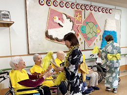 式典後のお楽しみ会では、スーツ姿から黄金に輝く着物姿に変身した施設長 と腰元ダンサーズによるマツケンサンバを披露させていただきました。陽気な サンバのリズムに誘われて、入所者さんも飛び入り参加!「オレ!」のポーズ もばっちり決まりました。