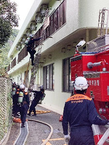 爽やかな秋晴れの日々が続くこの頃、山口苑では西宮市北消防署立ち合いの もと、防災訓練を行いました。 まずは消防署員の方の訓練を見学。統率された動きで梯子をかけ、颯爽と登っ ていかれます。頼もしいですね!
