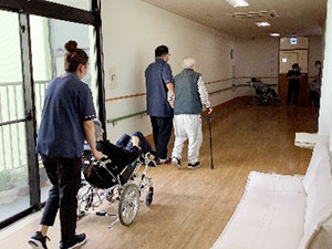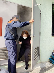 職員それぞれが役割分担し、宿直員は火災通報専用電話機を使用して消防署へ救助を要請。夜勤者は出火点に近い入所者から避難誘導を開始。