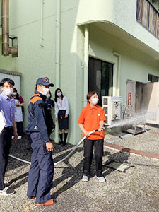 訓練でしたが、真剣に取り組み、訓練後はみんなクタクタになっていました。最後に水消火器を使用して、消火器の使い方を再確認し、消火訓練を行いました。