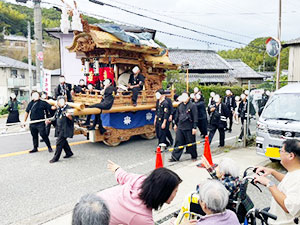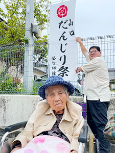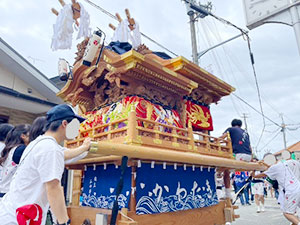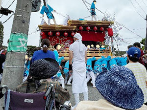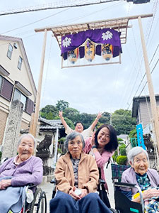 賑やかな音楽と威勢のいい掛け声と共に、今回参加された利用者さんの息子さんやお孫さんたちが曳く立派なだんじりが次々とやってきました。