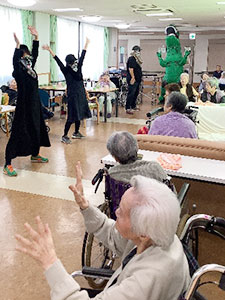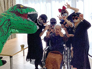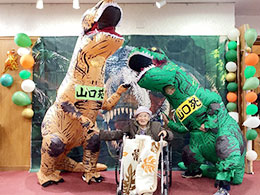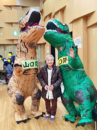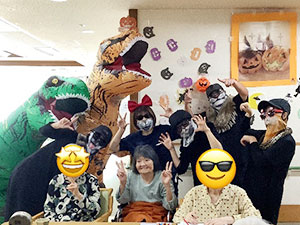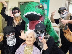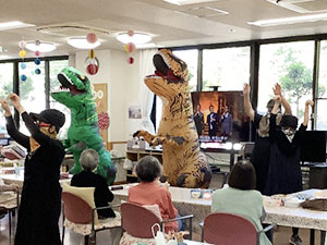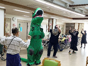 10月初旬は半袖Tシャツ1枚でも過ごせていましたが、急に寒くなりました ね。少し時期は早いですが、山口苑ではハロウィンをお祝いしました。 職員は仮装して妖怪体操を一緒に踊り、山口苑ではすっかり馴染みの恐竜も登 場! いつもと違う恰好にびっくりされていましたが、皆さん楽しそうに過ごされて いました。