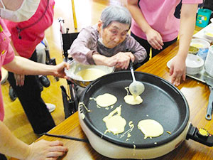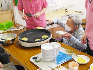 | 流し焼きをしました。 なれた手つきでお玉をにぎっていました。 ![]() |