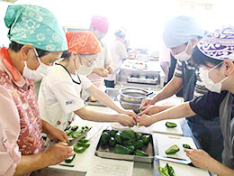 「かんたん!おいしく!健塩レシピで健康づくり」と題して、健康推進課 森岡管理栄養士と添田 食生活改善推進委員を講師にお招きし、生活習慣病予防のための講座(クイズ形式)と健塩レシピの調理実習を行いました。生活習慣病の要因となる塩分や糖分過多による体への影響を楽しく学ぶことができました。元気に仕事をするためには、「早寝、早起き、朝ごはん」を合言葉に生活リズムを整えていくことが大切ですね。普段料理はしないという参加者も積極的に調理に取り掛かる姿もあり、全員で協力し合いながら夏野菜たっぷりの料理が完成しました。少ない調味料でも野菜の旨味を存分に感じられ美味しくいただきました。