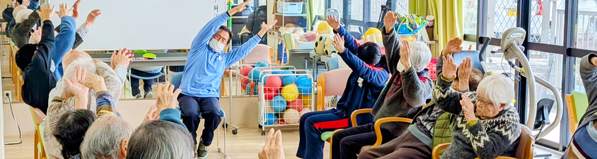 日常生活を送る上で介護や支援が必要な方に日帰りで来ていただいています。食事や入浴、機能訓練といったサービスの提供によりご利用者様の生活機能の維持改善を図ります。また、ご利用者様や職員など、人とのふれあいを通じて意欲の向上や心身の活性化、ご家族の身体的・精神的負担の軽減を図ることを目的としています。