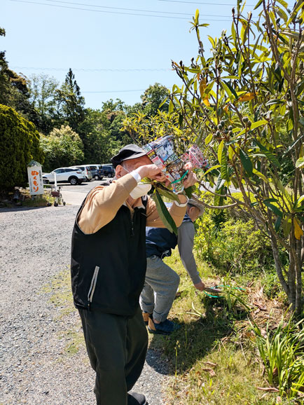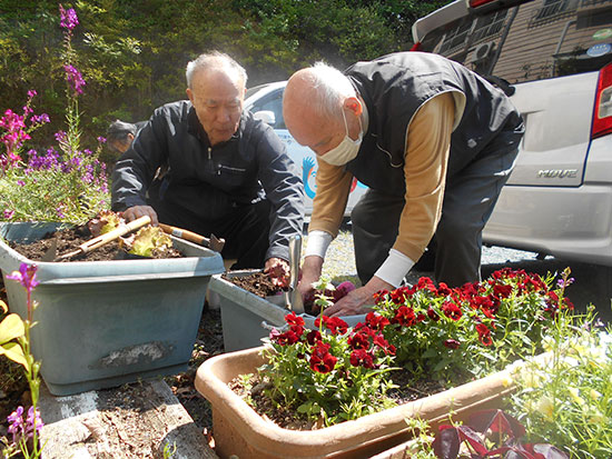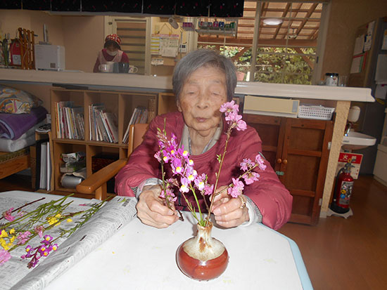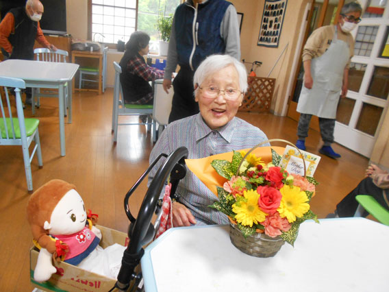 職員の自宅の庭先で作ったお花を添えて。楽しいお話、尽きません。
