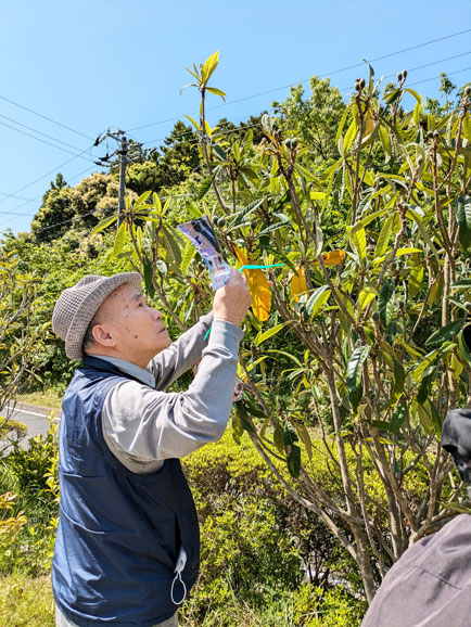 農園の方の説明を聞き、肥料などの質問をされる場面もありました。