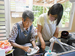 「いっぱいあるね、手伝うよ」と優しい利用者様。一緒に茶碗を洗っています。
