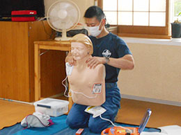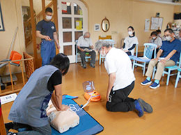 救急隊員による講習。心肺蘇生法を確実にできるよう取り組みます。