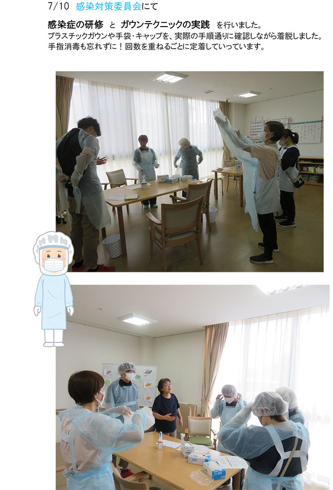 新型コロナウイルス感染症対策の一環で、職員対象のガウンテクニックの研修に参加しました。防護服の正しい着脱方法や消毒方法など、医療現場で行われている技術に戸惑いながらも、看護師から一つ一つの動作に意味があることの説明を聞きながら行うことで理解しやすく適切に行えたと思います。現場での経験が少ない私たちにとっては貴重な体験でした。いざと言う時のスムーズな対応は日頃からのこういう研修の積み重ねなのではないかと改めて感じています。早く普段の日常が戻ることを願いつつ、見えない敵に向かっての対策を続けていかなくてはと思っています。