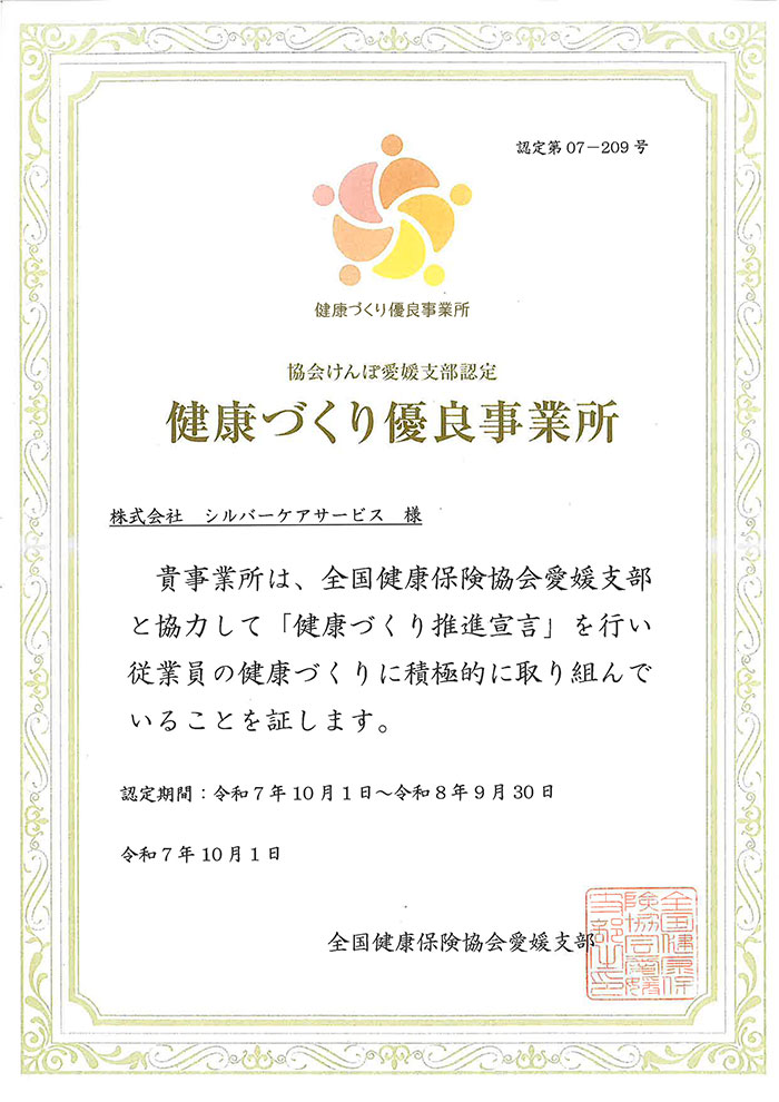 株式会社シルバーケアサービスは令和7年10月より、職員の健康保持・増進に積極的に取り組む法人として、協会けんぽ愛媛支部より「健康づくり優良事業所」に認定されました。