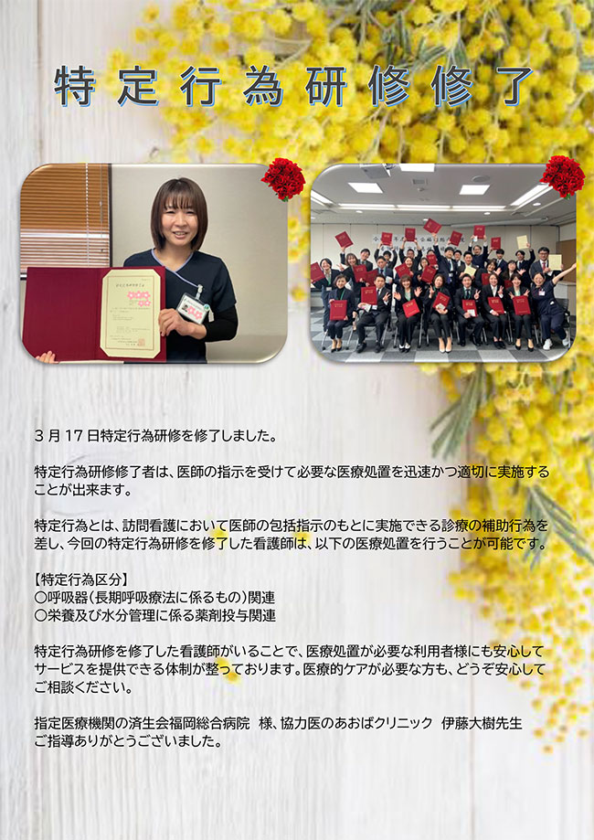 - 喀痰吸引等行為の個別研修機関に認定されました!
