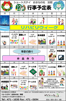 | 6月 | 紫陽花・菖蒲見学 | 12月 | クリスマス会/忘年会/もちつき |