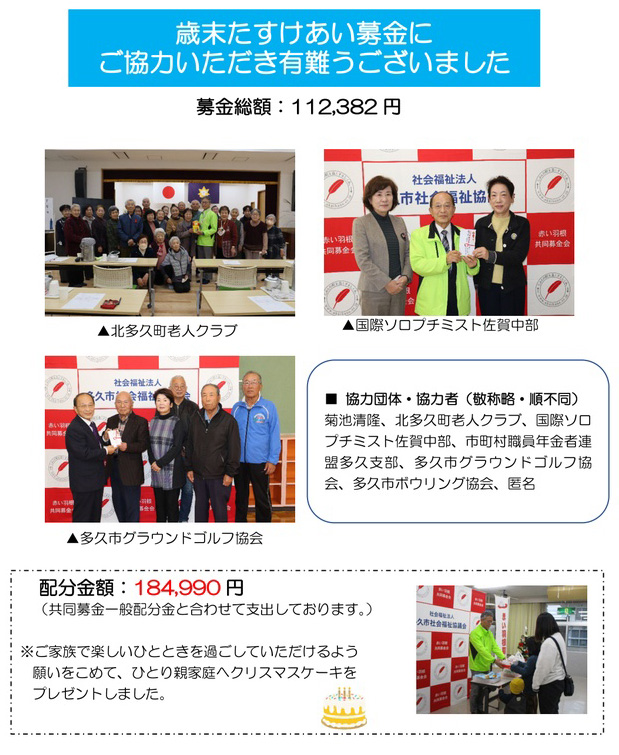 令和5年度は市内で共同募金(戸別募金、法人募金、資材募金等)3,042,604円の募金をお寄せいただきました。この募金額のうち、多久市の地域福祉活動事業として、令和6年度に2,308,936円配分されました。