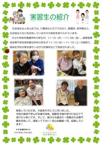 大分大学老年看護学科の学生が、11/10(月)〜11/28(金)、藤華医療技術専門学校理学療法学科の学生が11/10(月)〜11/15(土)の期間で、感染症予防対策を遵守しながら若葉苑などで実習されました。
