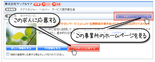 検索結果画面や事業所詳細ページでホームページを持っている事業所は「この事業所のホームページを見る」ボタンが表示されます。
