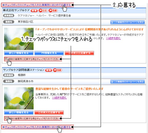 検索結果に複数の介護事業所が表示された場合、チェックボックスにチェックを入れた介護事業所に一括で応募することが出来ます。