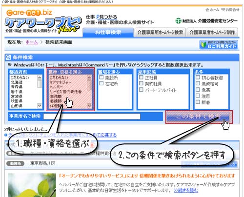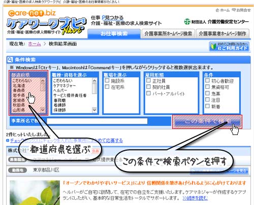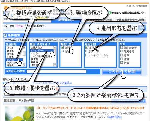 例えば東京都の施設で正社員のケアマネジャーとして働きたい場合は、右の図のように「1.都道府県を東京都」「2.職種をケアマネジャー」「3.職場を施設系」「4.雇用形態を正社員」で「5.検索」してみましょう。
