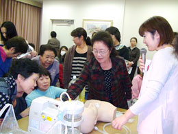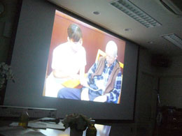 DVDも使用して「胃ろう」によるケアの仕方をわかりやすく学習しました。看護師さんによる講義に真剣に耳を傾けていました。 |