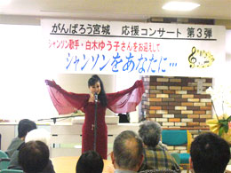 今回、その「がんばろう宮城!応援コンサート第3弾」が実現した。東京在住の有名なシャンソン歌手である白木ゆう子さんという方にシャンソンのライブをしていただくことになった。白木さんは2012年3月11日に、東日本大震災復興応援チャリティーショーを東京で開催する予定をされていて、その前にどうしても被災地に直接うかがって力になれたら・・・と思い、いろいろな方々のつながりの果てにわが社でコンサートをしていただけることになった。