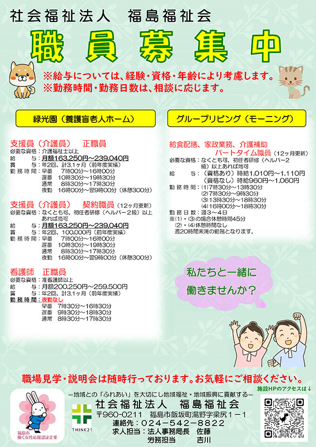 社会福祉法人 福島福祉会では下記スタッフを募集しております。