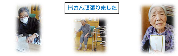 競技はスリッパ投げ、新聞たたみゲーム、玉入れの3競技を行い、皆さん運動会を楽しんでおられました(^^)。