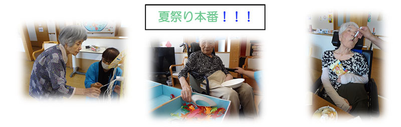 先月は猛暑に大雨…大変でしたね(´・ω・)。まだまだ暑い日は続くので皆さん気を付けましょう。 さて、ついにこの日がやって参りました♪7月30日に夏祭りを行いました(^^♪。 金魚すくい、千本引き、輪投げの3つの屋台を楽しまれました。ポイで金魚をいっぱいすくったり、千本引きでお菓子を大量にゲットして喜ばれている方もおりました(^^)。また、輪投げでは狙いを定めて上手に輪を投げておりました。夏祭りの後にはおやつにプリンアラモードを召し上がり「ハイカラで美味しい」と喜ばれておりました(*´ω`*)♪