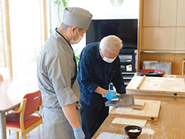 皆様の目の前でそば打ちの実演会をおこなっていただきました。