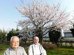 暖かな春の日に、庭に満開に咲いた桜の花がとてもきれいでした。皆さん庭に出て、桜やチューリップ、緑の景色を眺めながら穏やかな時間を過ごしました。