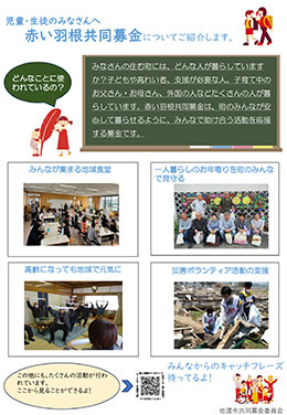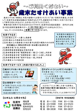 歳末たすけあい事業は、市民の皆様からお寄せいただいた「赤い羽根共同募金」を活用して佐渡市社会福祉協議会が実施するものです。高齢者の方や障がいを持つ方が安心して新年を迎えられるように、お手伝いをさせていただきます。