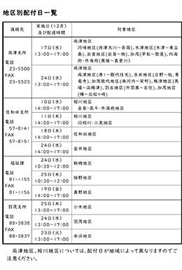 事業内容と利用できる方についてはチラシをご覧ください。お申し込みは佐渡市社会福祉協議会各支所または地区の民生委員児童委員の方へ、11月19日(水)までにお願いします。・チラシ(両面)>>PDFダウンロード
