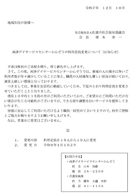 - 2025/12/15NEW 両津デイサービスセンターかんぞう定員変更のお知らせを掲載しました。