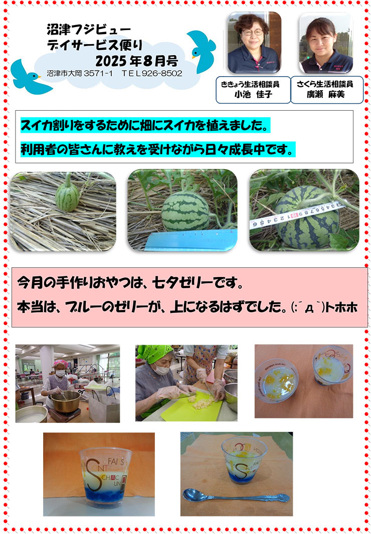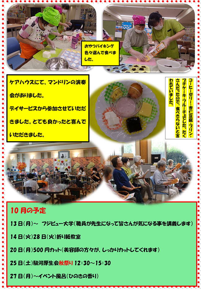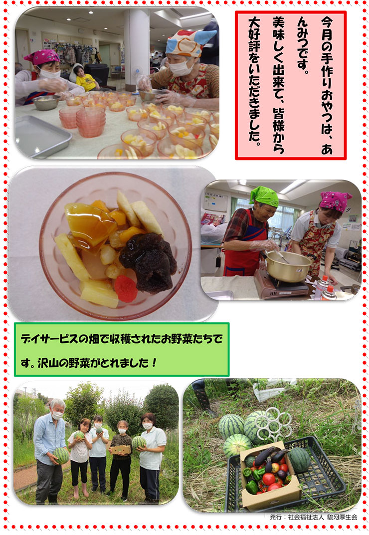 - レクリエーション活動 : ゲーム、カラオケ、ビデオ鑑賞、野菜の収穫作業、作品作り、手作り料理、誕生日会