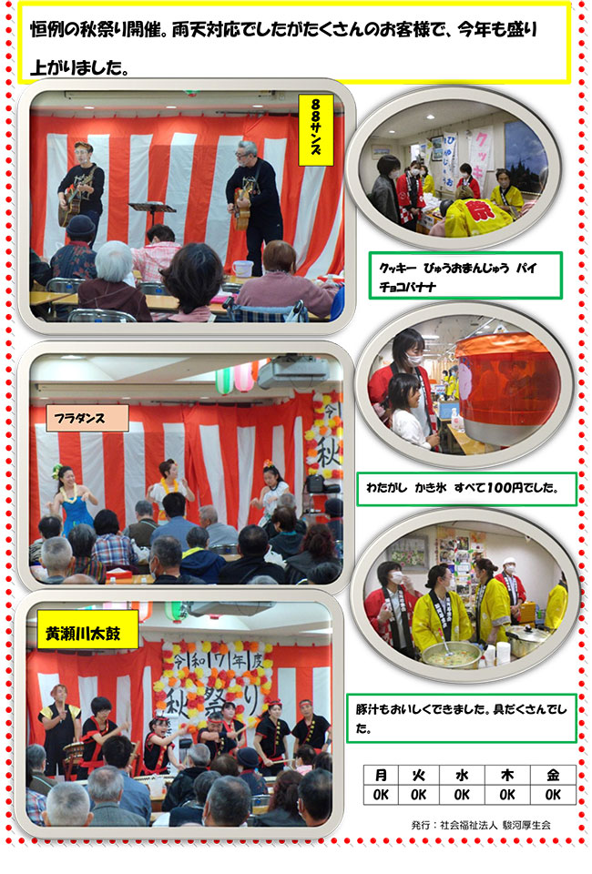 - サークル活動 :習字、折り紙教室、手芸、大正琴、水墨画