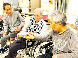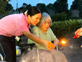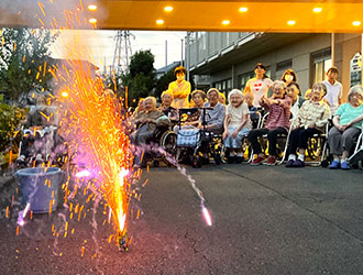 8月下旬、夏の恒例行事として花火大会を行いました。夕暮れの涼しい風を感じながら、手持ち花火を楽しむ方や打ち上げ花火を眺めながら拍手される方もいて「綺麗だね!」「懐かしいね」とたくさんの笑顔が見られました。途中でジュースを飲みながら一息つき、花火と共に残り少ない夏を感じながら、笑顔と歓声に包まれた心温まるひとときとなりました。