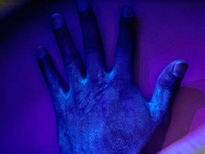 洗い残し部分が青く光ります※ 洗い残しが多い部分はしわの部分や親指の付け根、爪と皮膚の境目や手の甲予備の付け根などになります