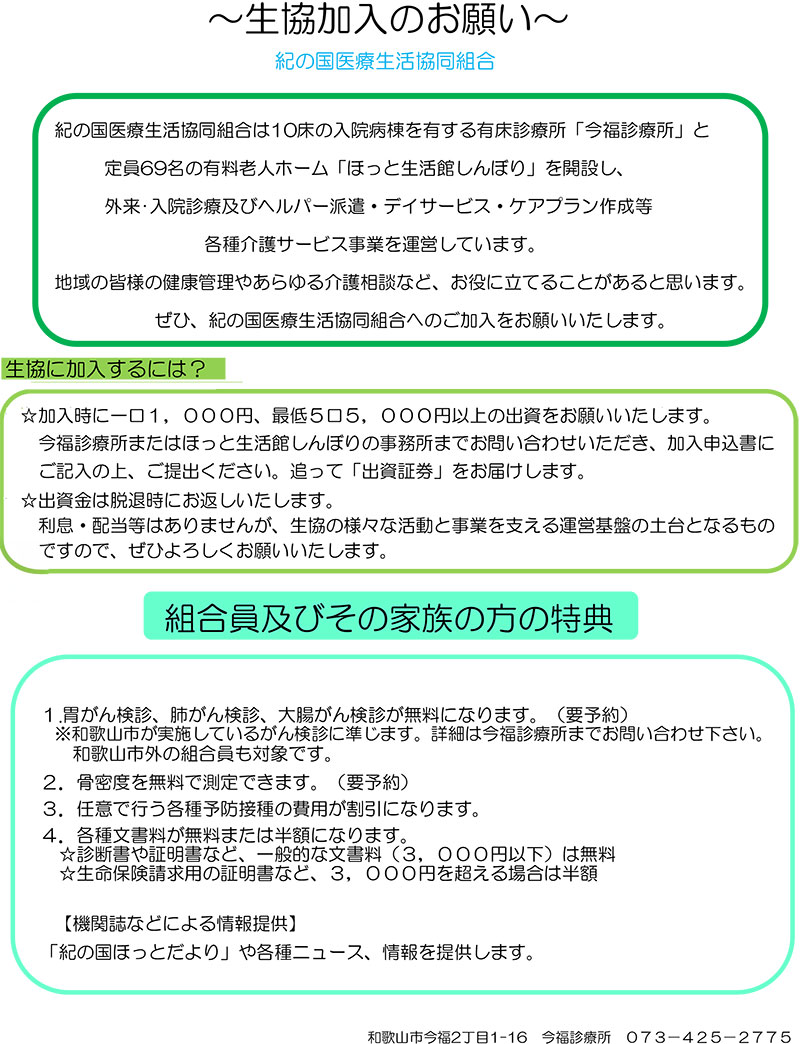 更に「認知症の人と家族の会和歌山県支部」とも緊密な連携をとっています。C「在宅医療」にも力を入れ、訪問診療・訪問看護・訪問リハビリ・在宅終末ケアなどに可能な限り積極的に対応しています。