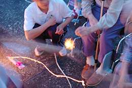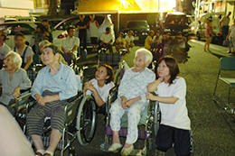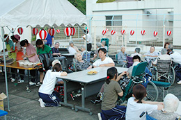 夕涼み会(毎年8月) 施設の屋上を利用し、たこ焼き等の料理とソフトドリンクでビアガーデンの雰囲気を利用者の皆様に味わってもらい、夏の一夜を楽しんでもらいます。 |