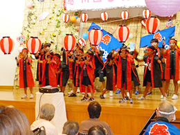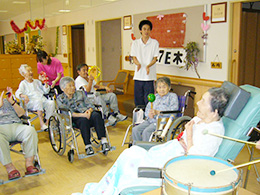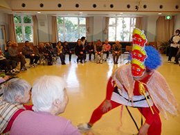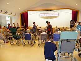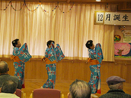 誕生日会(毎月1回) ボランティアグループの慰問団体が来園し歌や踊りを利用者の方々に披露してくれます。誕生日月の利用者の方にはささやかなプレゼントも用意しています。 |