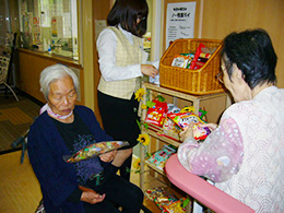 ワゴンショップひまわり(毎日) ワゴンに色々なお菓子を乗せて販売しています。利用者の皆さんには、小さな駄菓子屋さんで、お菓子を買うような気分を楽しんでもらっています。 |