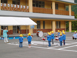 合同運動会(毎年10月) 地域交流ホールにて、鮎川保育園の園児とともにボールなどを使った合同運動会を行っています。 |