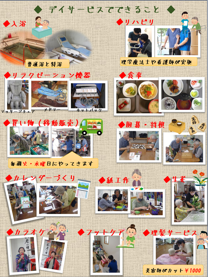 - 手芸・体操・囲碁・麻雀・パズル・書道・園芸・料理教室・外出行事等