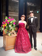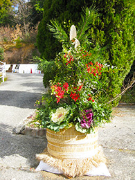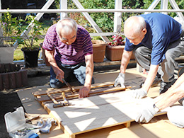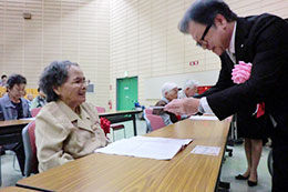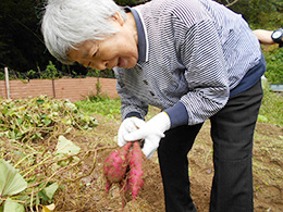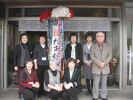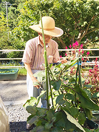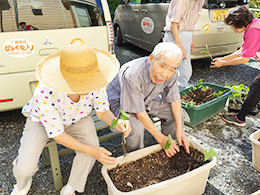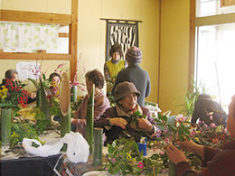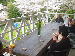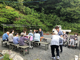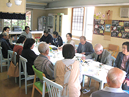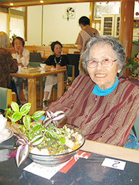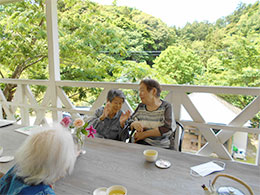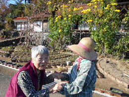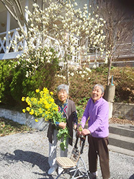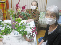 職員の自宅の庭先で作ったお花を添えて。楽しいお話、尽きません。