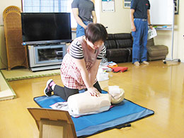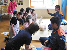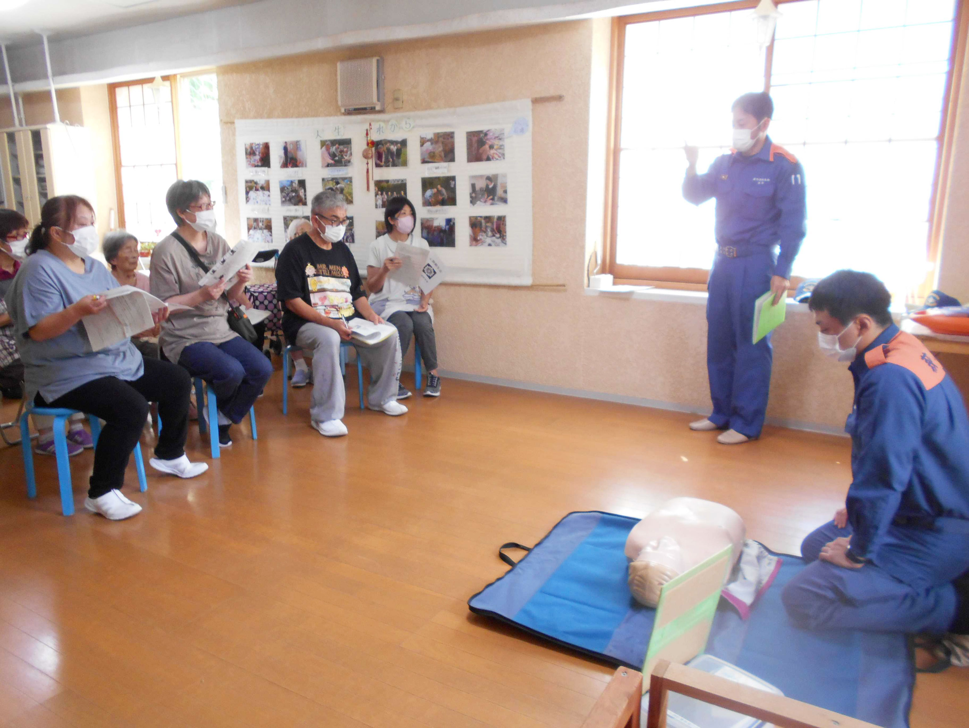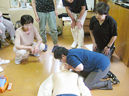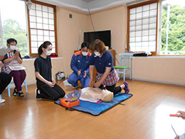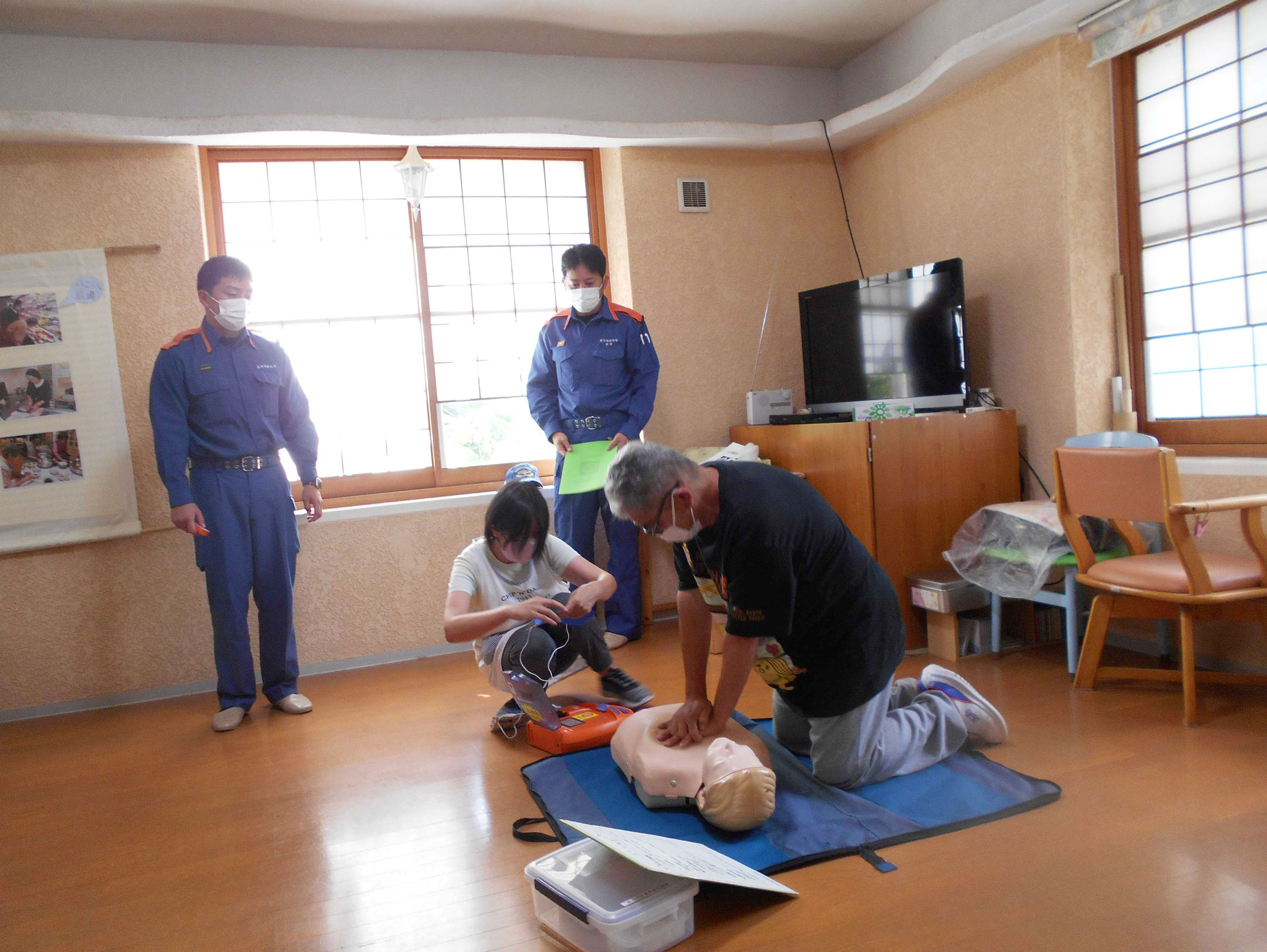 救急隊員による講習。心肺蘇生法を確実にできるよう取り組みます。