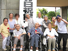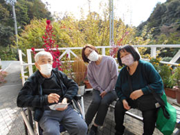 ぬくもりでは、マスク着用のもと、玄関前での面会を実施しています。みなさん笑顔で、水入らずのひとときを過ごされます。