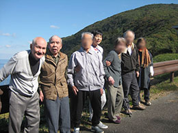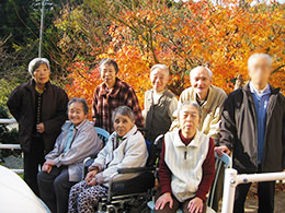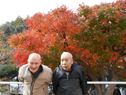 ご利用者の男性陣。ぬくもりの紅葉のもみじ前で2ショットです。
