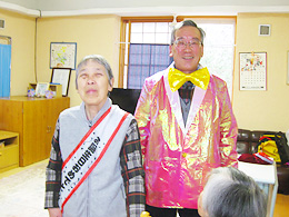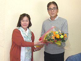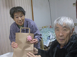 1月のお誕生日のご利用者さん(左)へ小さなプレゼント 右のご利用者さんに手渡して頂きました。